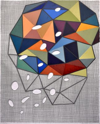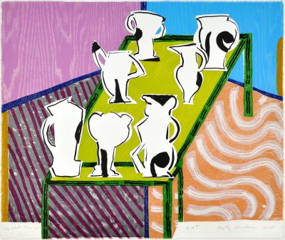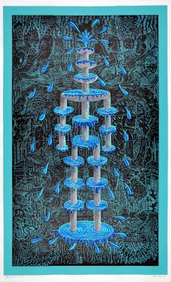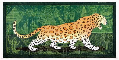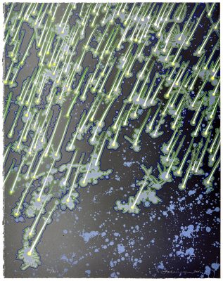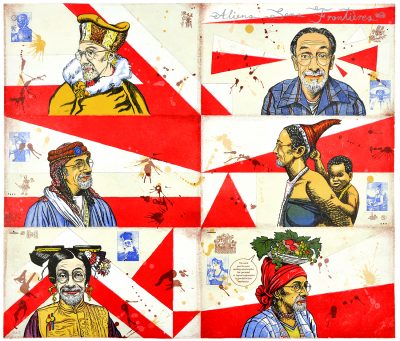 “Aliens Sans Frontièrs” is a nine color lithograph hand printed on handmade Amate paper in an edition of thirty, plus proofs. It was printed from nine plates made from mylars hand-drawn and painted by the artist using toner washes, acrylic paint and pencils.